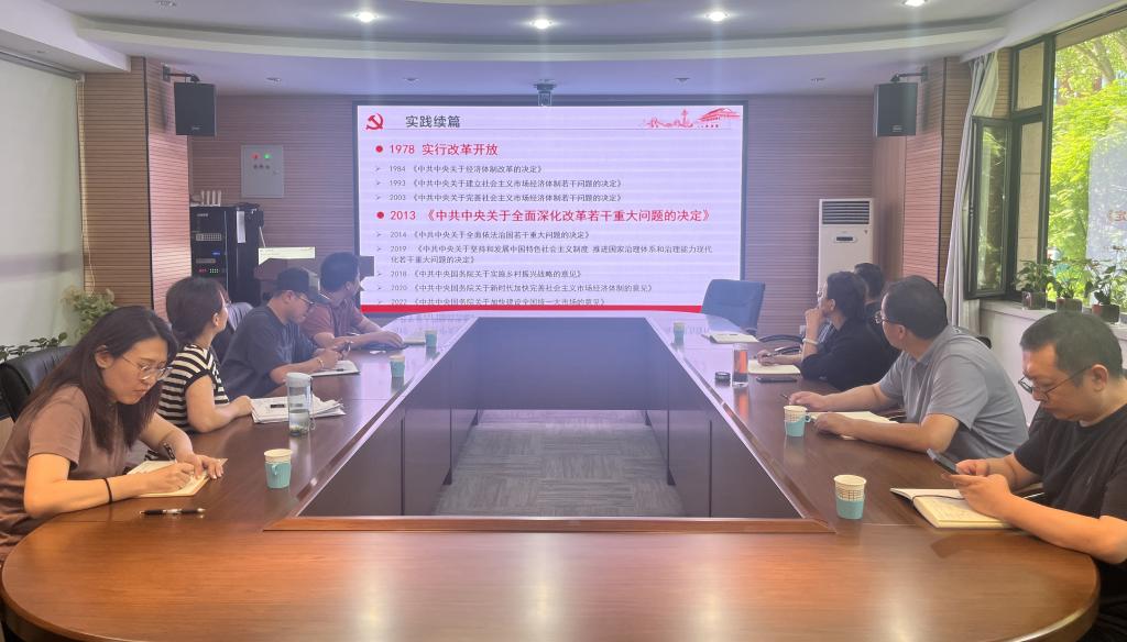 2024年8月22日下午,公司党委理论学习中心组在知行楼(经管楼)115会议室召开学习会议,专题学习党的二十届三中全会精神。本次学习会议邀请了公司副教授、经济系专任教师王乾宇主讲,由公司党委书记李宏宇主持,中心组成员参加了会议。