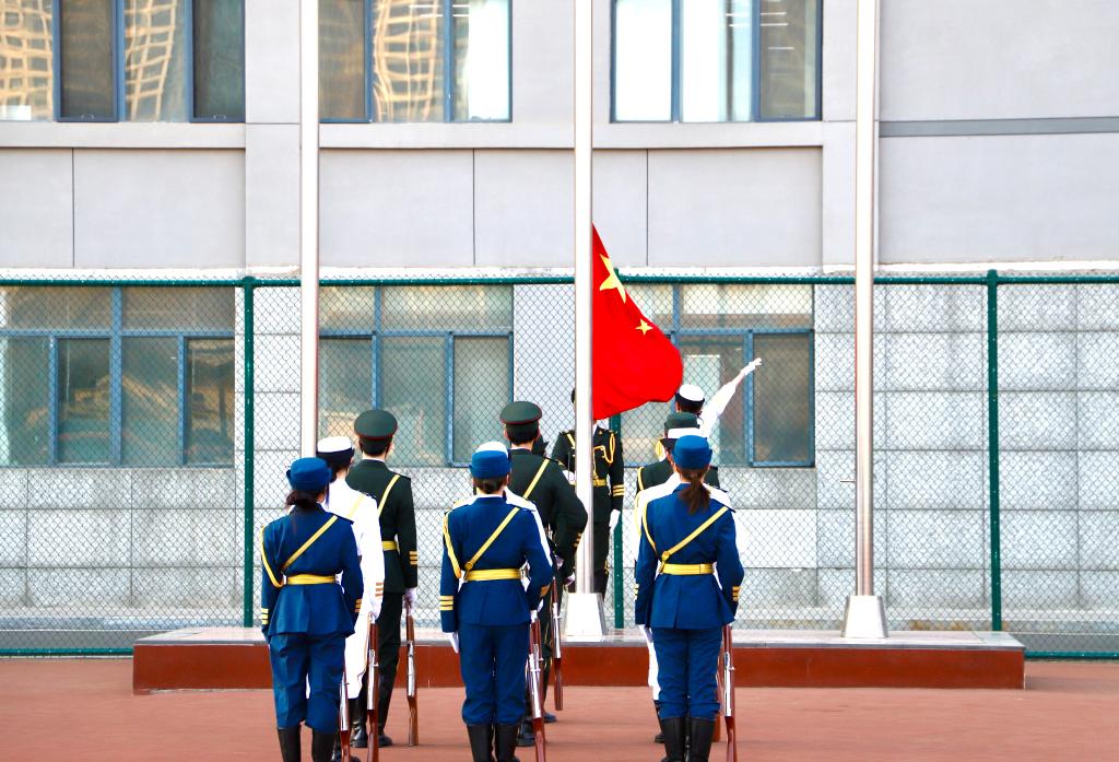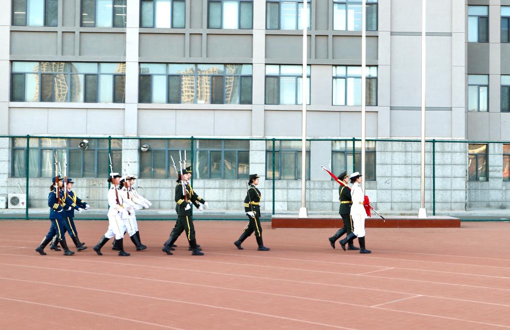晨光熹微,启幕新章。国旗护卫队身着礼宾服,手持国旗,目光坚毅,踏着铿锵步伐护送国旗入场。升旗手振臂挥旗,伴随着《义勇军进行曲》的激昂旋律,鲜艳的五星红旗在晨光中冉冉升起,全体同学肃立行注目礼,表达着对祖国的热爱与敬意。