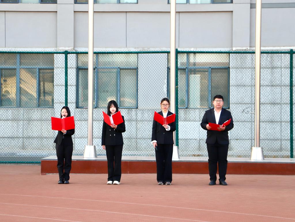 国旗礼毕,公司员工代表2024级经济学专业魏丹阳、2024级工商管理专业李妍、2024级会计学专业陈炳仁和2024级会计学专业杨珊四位同学为我们带来了国旗下的朗诵。他们的声音或激昂高亢,或深情婉转,用真挚的情感和优美的辞藻,以时空经纬编织壮阔画卷,以如椽诗笔熔铸百年风华。新时代青年当以此磅礴之声为号,进一步坚定“感党恩 听党话 跟党走”的决心和信心,在历史坐标上镌刻青春的印记。