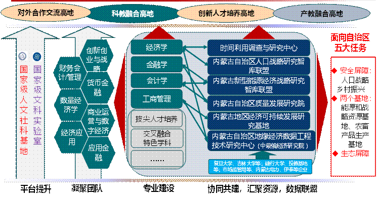 公司着力建设内蒙古自治区哲学社会科学重点研究基地—内蒙古地区经济可持续发展研究基地、内蒙古自治区高等公司人文社会科学重点研究基地—中国时间利用调查与研究中心等6个自治区级科研平台和中蒙俄经济研究院等6个校、院级科研平台;与西南财经大学等高校共建中国高校数据联盟,与乌拉尔联邦大学共建中俄行为经济学联合实验室,与复旦大学等高校共建中国国家能源基地绿色化数字化双转型发展智库联盟、与复旦大学共建能源与碳中和战略研究院。
