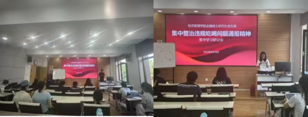 为深入贯彻落实中央八项规定精神,进一步加强作风建设,2025年6月16日下午,金融专硕党支部在知行楼309教室召开了集中整治违规吃喝问题专题学习研讨会,支部书记陈晨主持会议。