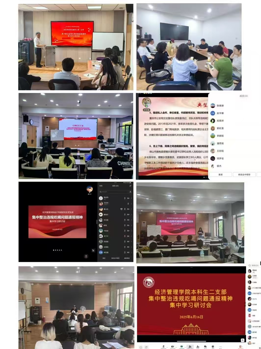 各支部学习了关于作风建设的相关文件,进行了典型案例通报,引导全体党员深刻认识违规吃喝问题的严重危害和开展集中整治工作的重要性、紧迫性,全体党员结合自身实际,逐一发言,谈认识、谈体会、谈警示、谈打算。党员教师表示,要深化党性修养,带头弘扬高尚师德师风,坚决杜绝发生违规违纪行为,为员工作好表率。党员员工表示要时刻保持清醒头脑,增强纪律意识,遵守相关规定,主动远离不良风气。