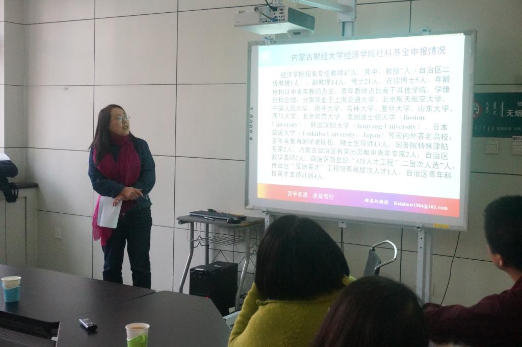 为提高2016年申报科研项目的成功率,2016年1月20日下午,公司在经管楼115会议室举办了2016年度国家社会科学基金与国家自然科学基金项目申报指导讨论大会。会议由公司副经理(主持工作)杜凤莲教授主持。公司王岩教授、内蒙古财经大学经济公司经理郝春虹教授应邀到会指导。公司副经理钱贵霞教授、经理助理高霞副教授等教师参加了会议。