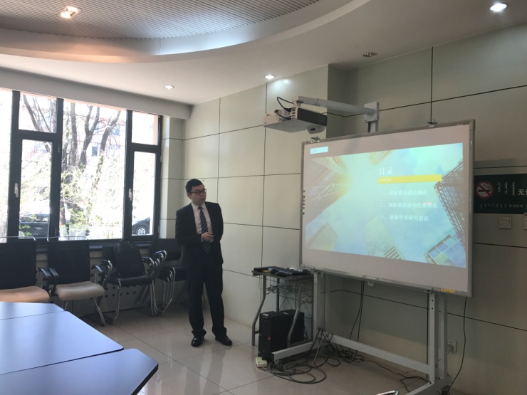 尹智超博士作了题为“国际资本流动理论”的报告。他首先对国际资本流动的含义和类型等基本概念进行简介。然后重点阐述了经典费雪的国际资本流动理论和麦克杜尔的国际资本流动理论,并通过评述,引出其发表的《资本账户开放、资本流动与金融稳定——基于宏观审慎的视角》一文的创新之处,即考察国际资本流动中的资本账户开放因素、在经典的柯布道格拉斯生产函数中融入外国资本因素、福利分析。最后,尹智超博士简要介绍上述文章的结论,以及最新学术研究前沿,并介绍了两篇外国优质文献。