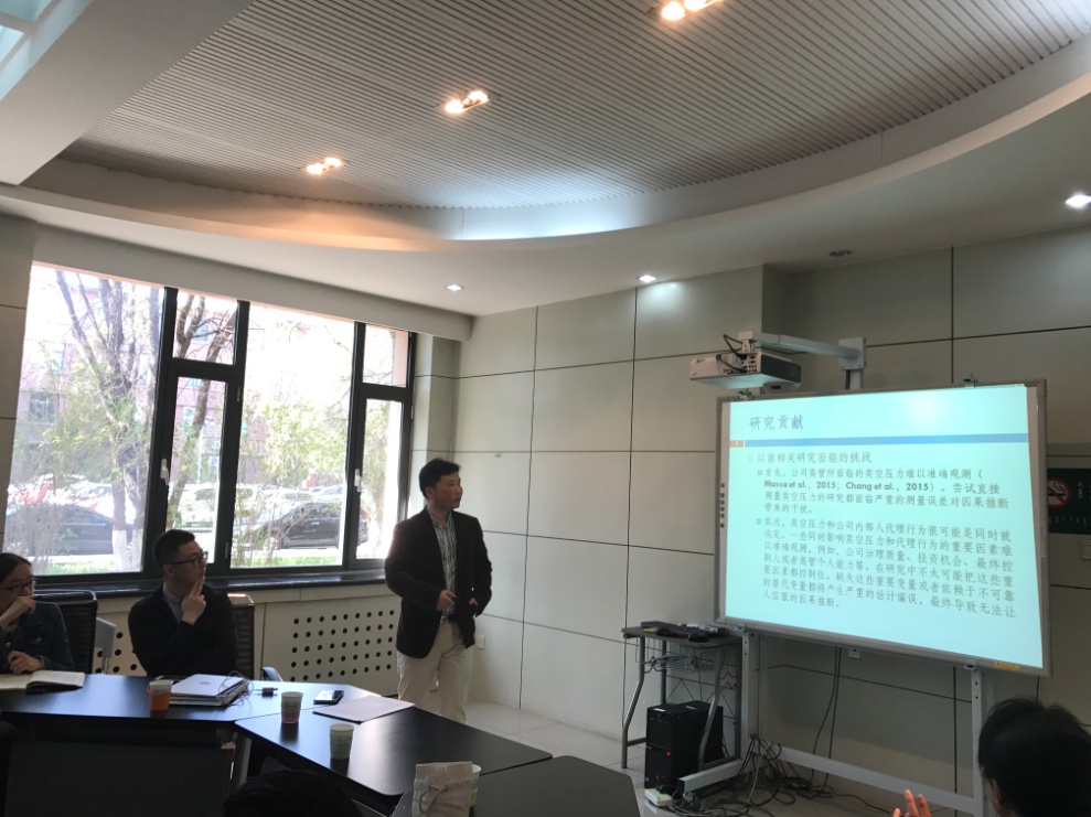 在纪念公司建校60周年活动中,公司决定主办“礼敬校庆——经管院系列学术讲座”。首场学术讲座于2017年4月26日举行,金融系陈胜蓝教授担任主讲,金融系主任梁斌博士、青年教师宋云玲博士、许红梅博士和相关专业的研究生参加了讨论。