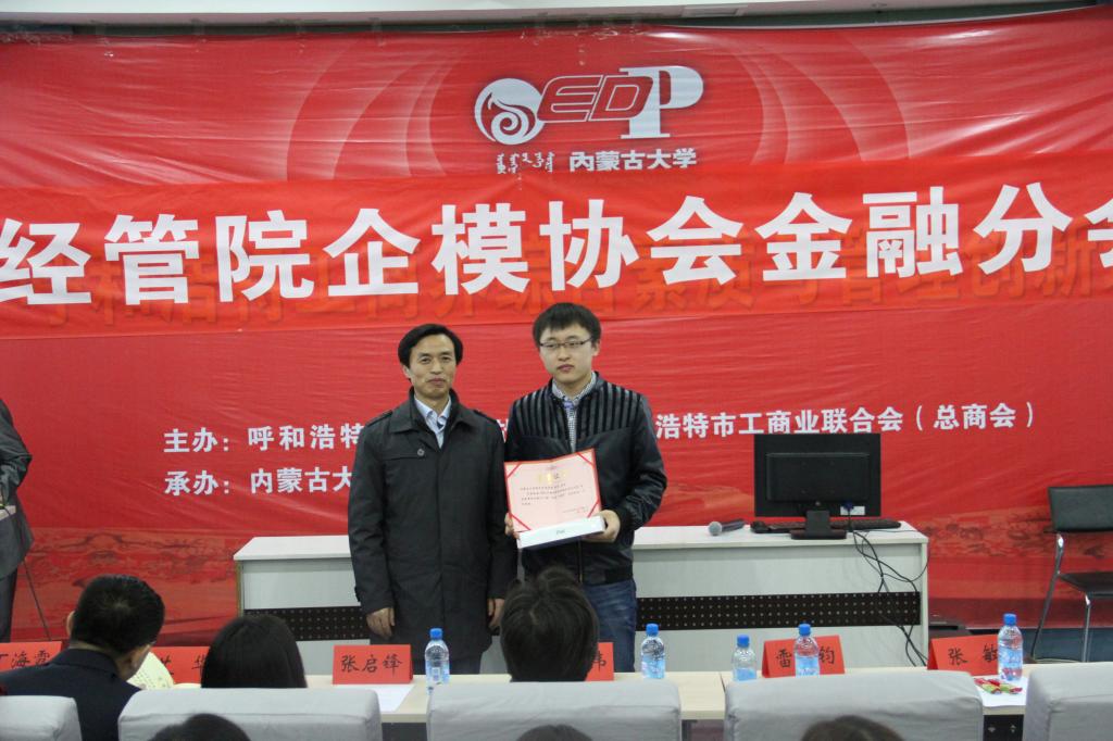2013年12月6日星期五晚7点,经管院企模协会金融分会成立大会隆重举行。公司党总支张士伟书记、经理助理、管理科学系主任张启锋老师、金融系主任雷立钧老师、实验中心主任艾华老师、教务办主任张青军老师、以及经管院金融系和经济系的杨云峰老师、薛继亮老师、李婵娟老师、苏木亚老师、实验中心丁海霞老师、协会指导教师张彻老师出席了大会。 张士伟书记致开幕词并宣布了经管院企模协会金融分会正式成立。张书记说,开展实践实验教学,对于贯彻党的教育方针,提升员工综合素质,促进员工全面发展,有着十分重要的意义,金融分会的成立标志着公司金融实践活动进入了一个新的阶段,同时也为公司相关专业员工参加证券、期货等金融类竞赛的培训工作拉开了序幕。张书记还对公司同学提出了几点期望,鼓励协会将金融分会做好,打下坚实的专业实践技能,为就业做好充分准备。 会上,由协会发起人之一的高晔同学对协会的发起情况、成立的宗旨与意义进行了讲解并简单回顾经管院金融协会前身——金融实践学习小组的建立历程和参加比赛获得的奖项。 大会随着激动人心的颁奖仪式进入了高潮,张青军老师为第三届“国泰安杯证券投资模拟实训大赛”优秀指导教师张彻、艾华老师颁奖;苏木亚老师、杨云峰老师、李婵娟老师、薛继亮老师为吕国云、刘景阳、郭蒙蒙、贾昊东、廖富超、辛喜荣、呼和等大赛校级获奖同学颁奖;金融系主任雷立钧教授为大赛优秀奖获得者高晔同学颁奖;张启锋老师为团体一等奖代表吕国云颁奖;张士伟书记为全国一等奖获得者杨策同学颁奖,全场响起了热烈的掌声。 颁奖仪式结束后,国泰安证券投资模拟实训大赛全国一等奖获得者杨策同学发表了获奖感言,张彻老师总结近两年金融小组的实践教学活动和大赛具体指导工作。 金融系主任雷立钧教授为金融分会的成立大会致闭幕词,并代表金融系对协会成立表示祝贺与支持,同时雷教授也提出强化实践教学的重要性,希望经管院金融专业快速与国际接轨,为自治区培养出大批合格的优秀金融专业人才。