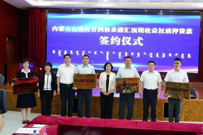 2022年6月15日,在全国第十个低碳日到来之际,在自治区生态环境厅、pa集团官网入口、鄂尔多斯市政府、杭锦旗政府相关领导的见证下,伊泰北牧田园公司与蒙商银行鄂尔多斯市支行在鄂尔多斯市杭锦旗举行签约仪式,以50万亩碳汇林项目碳汇预期收益权为质押品获得绿色贷款融资,迈出了自治区历史上碳汇权益质押的重要一步。同时举行了pa集团官网入口绿色金融实习实训基地挂牌仪式。