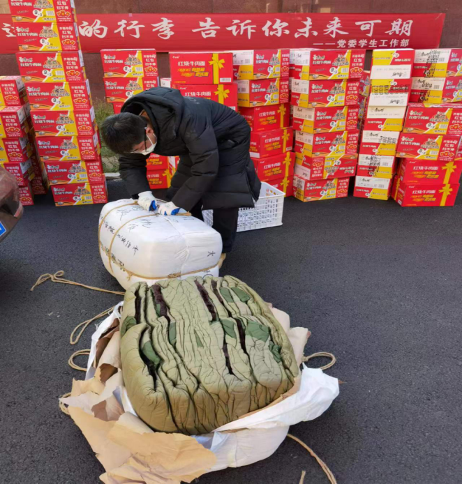 图3 经管员工安彪(2012级金融学本科,2017级应用经济学硕士)助力的批物资于10月10日下午抵达