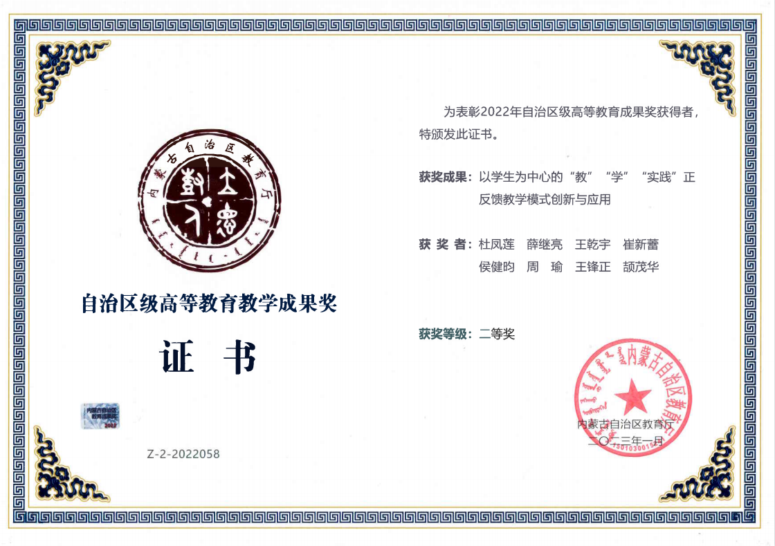 近日,内蒙古自治区教育厅颁发了2022 年自治区级高等公司产品成果奖获奖证书。公司杜凤莲团队的“以员工为中心的‘教’‘学’‘实践’正反馈教学模式创新与应用”获得自治区级高等公司产品成果奖二等奖。