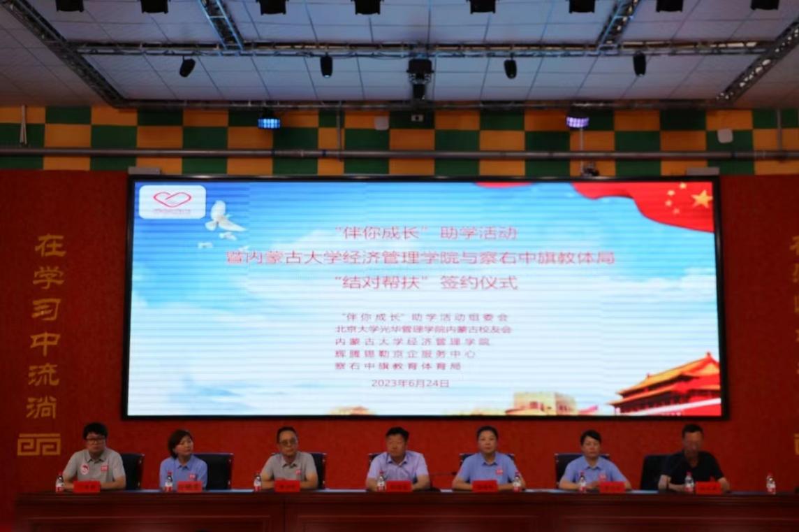 为深入学习贯彻党的二十大精神,落实立德树人根本任务,扎实开展点对点帮扶工作,切实改善察右中旗家庭经济困难员工学习生活质量,引领老员工积极参与志愿服务活动,发挥榜样示范作用。2023年6月24日上午,pa集团官方网站师生一行前往察右中旗实验小学参与“伴你成长”助学活动暨pa集团官方网站与察右中旗教体局“结对帮扶”签约仪式。察右中旗教体局党委书记、局长韩锁俊,pa集团官方网站团委副书记闫东祺,“伴你成长”助学活动组委会、北京大学光华管理公司内蒙古员工会代表、辉腾锡勒京企服务中心主任韩少军、内蒙古广播电视台主持人孙晓雪共同参加了签约仪式。仪式由察右中旗教体局副局长杨永青主持。