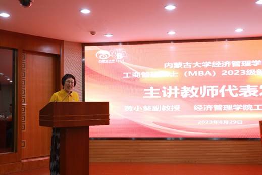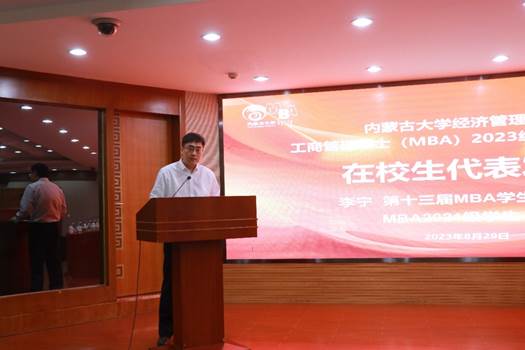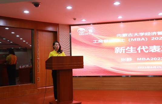 2023级张静同学代表新生发言。她表达了被内大MBA录取后的骄傲自豪的激动心情。她代表MBA2023级的同学们向公司、公司表态,在校学习期间,会以最饱满的热情,最全面的投入,最实际的行动严格遵守校规校纪,服从公司安排,认真完成公司的课业要求,不负内大校院领导和老师的教诲和期望。