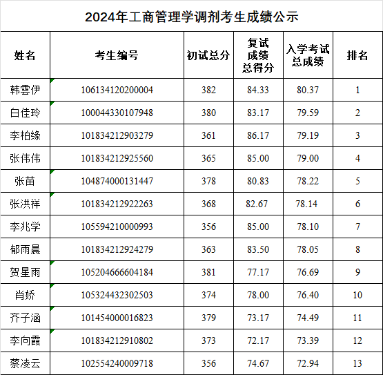 2024年工商管理学调剂考生成绩公示