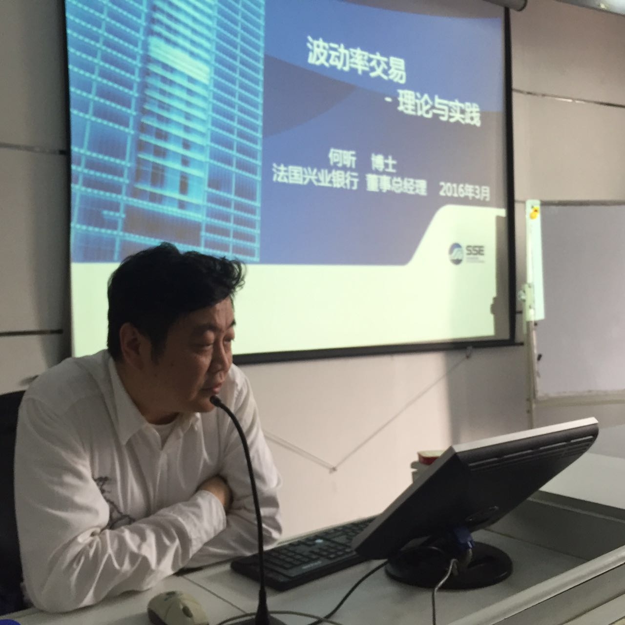 讲座中,何昕老师详细介绍了波动率类型、波动率估值方法、实务中预测波动率的主要模型以及波动率在期权交易中的使用等,并耐心解答了现场老师和同学提出的关于当前经济形势、场内衍生品发展状况、“互联网+”金融业发展趋势等相关问题。