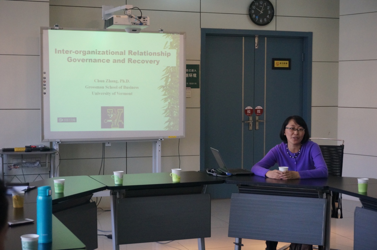 张春老师的报告围绕关系治理的主题,对文化、信任、制度与法律规范等要素对组织间关系治理的作用进行了分析,还从组织间关系行为规范的角度,以美国汽车制造企业及其全球分销商为例,对组织间的关系修复中,正式合同方式和社交方式对机会主义认知和合同误解的优劣性进行了阐释。