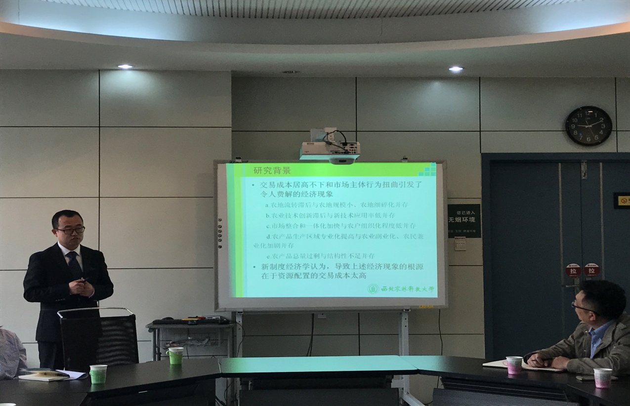 西北农林科技大学侯建昀博士报告的题目是“专业化苹果种植户市场行为研究——基于交易成本视角的理论和实证”。他围绕古典经济学和新古典经济学对农户市场行为研究逻辑上的分歧,融合了新制度经济学和新古典经济学两个主流学派的分析方法,构建一个一致的交易成本不为零条件下的农户行为分析框架,对交易成本如何影响农户的要素配置和产品市场参与;交易成本可以诱致出哪些制度创新和制度安排;政策创新和制度创新的切入点等三个问题作探讨,并给出一些政策建议。