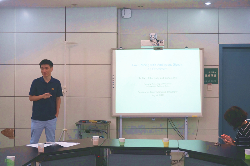 2019年7月4日上午9时,新加坡南洋理工大学助理教授包特博士,应邀为公司师生作了题为“Asset Pricing with Ambiguous Signals: An Experiment”的学术报告。报告会由金融系主任梁斌副教授主持,参加报告会的有杜凤莲经理、彭长桂教授、陈胜蓝教授、许红梅博士、吴晓华老师以及公司相关专业本科生和研究生。
